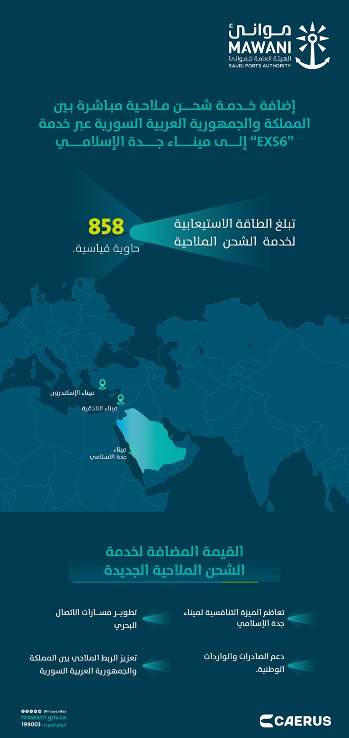 أعلنت الهيئة العامة للموانئ “موانئ” عن إضافة خدمة الشحن الجديدة “EXS6” التابعة لشركة ”Caerus” إلى ميناء جدة الإسلامي، التي تُعد إحدى خدمات الشحن الملاحية المباشرة بين المملكة والجمهورية العربية السورية.