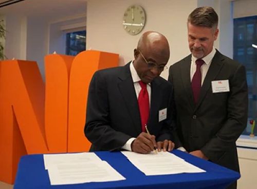 Dr. Abubakar Dantsoho, Managing Director of Nigerian Ports Authority, and Frederik Klinke, CEO of APM Terminals Nigeria, sign the MoU.